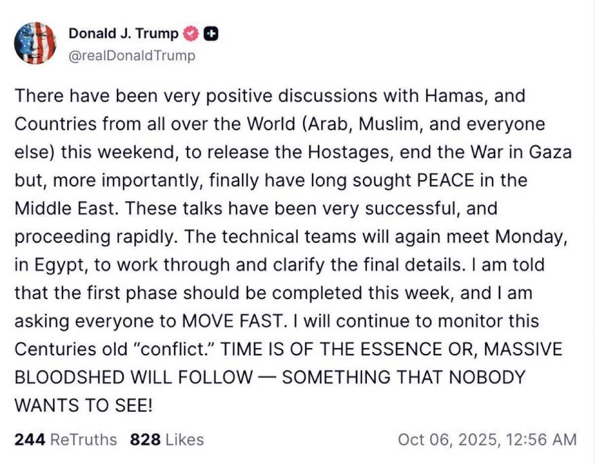 特朗普5日在社交媒体“真实社交”上发文称,周末与哈马斯以及各方进行了“积极讨论”,相关对话“非常成功,进展迅速”,技术团队于6日在埃及再次会面,商讨并明确最终细节。